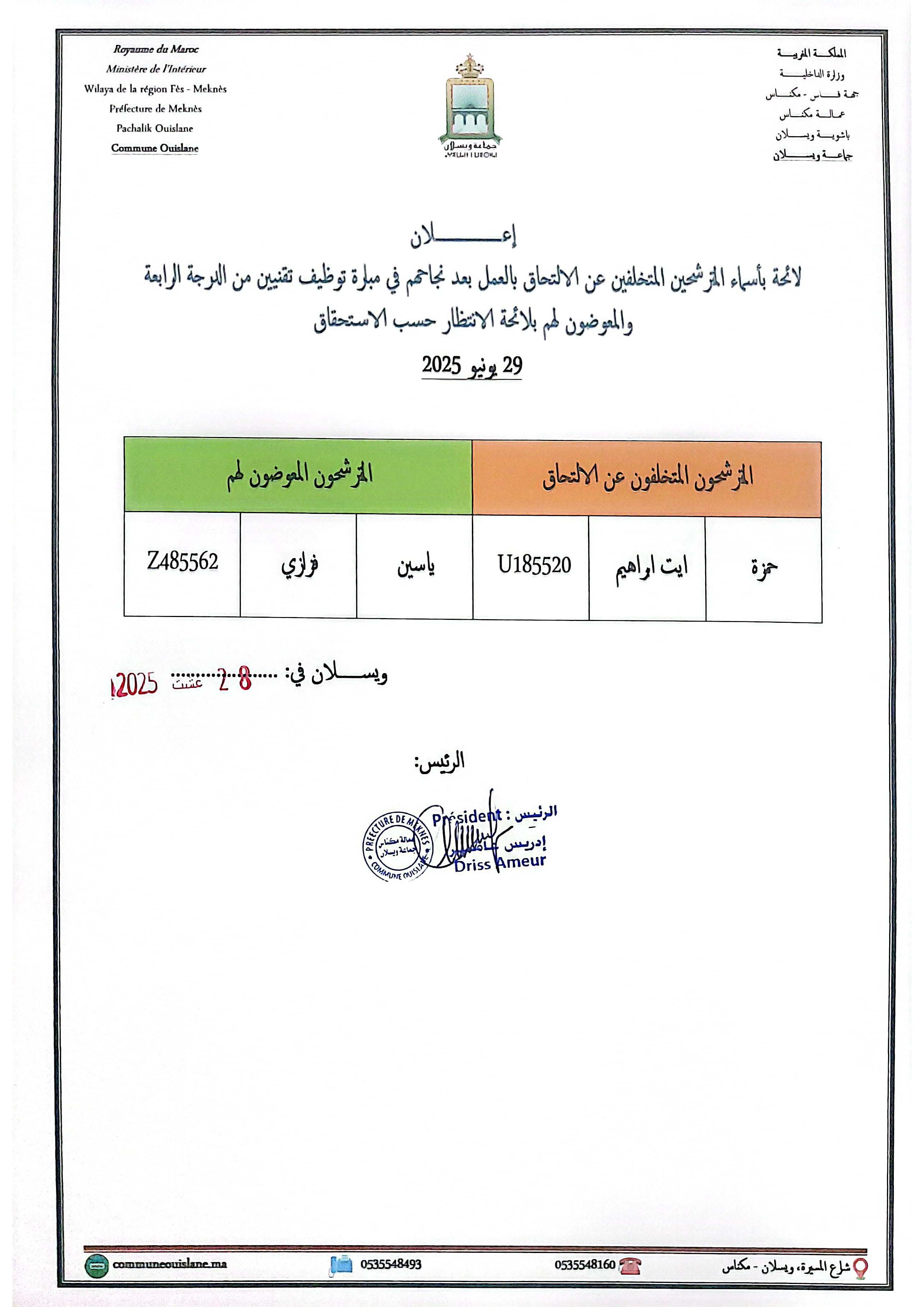 إعــــــــــــــــــلان لائحة بأسماء المترشحين المتخلفين عن الالتحاق بالعمل بعد نجاحهم في مبارة توظيف تقنيين من الدرجة الرابعة والمعوضون لهم بلائحة الانتظار حسب الاستحقاق