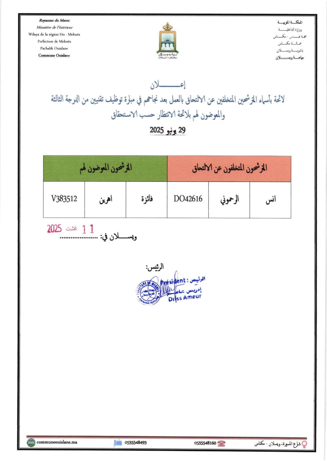 إعــــــــــــــــلان لائحة بأسماء المترشحين المتخلفين عن الالتحاق بالعمل بعد نجاحهم في مبارة توظيف تقنيين من الدرجة الثالثة والمعوضون لهم بلائحة الانتظار حسب الاستحقاق